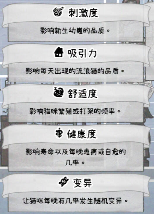 喵喵的结合中房子和房间分别由刺激度、吸引力、舒适度、健康度、变异值这五个数值,分别影响着猫咪的各项属性,下面就为大家分享房子各项数值对猫咪的影响。