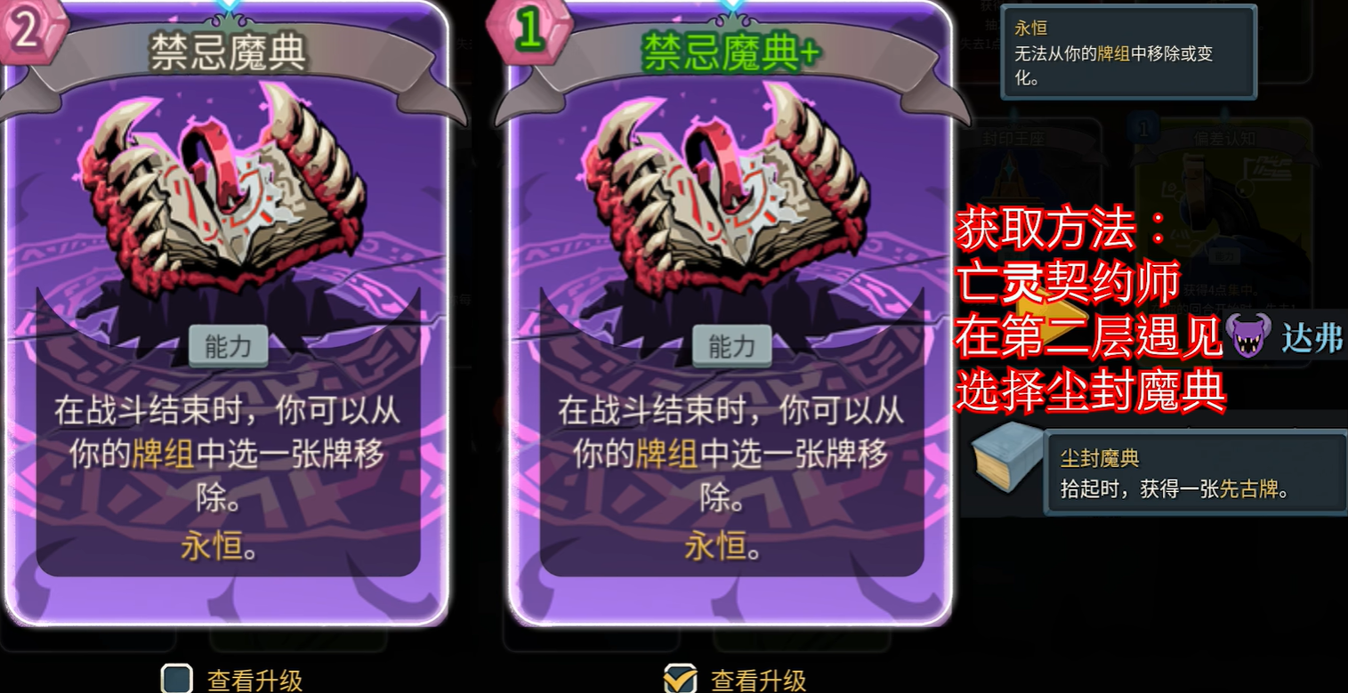 在获取方式方面,角色限定为该卡牌为亡灵契约师专属,其他角色无法直接获取。获取途径是在第二层遇见 Boss 达弗,这是关键的节点。选择奖励则是击败达弗后,在奖励选项中选择尘封魔典。尘封魔典效果为拾起时,获得一张先古牌。通过此方式可获得禁忌魔典卡牌,玩家需注意把握机会。