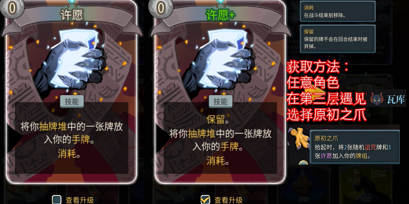接下来是具体的获取方式说明。该卡牌角色限定为任意角色均可获取,没有职业限制。获取途径是在第三层遇见 Boss 瓦库并将其击败。在选择奖励时,必须选择原初之爪才能获得相关卡牌。需要注意的是,原初之爪效果为拾起时,将两张随机诅咒牌和三张许愿加入你的牌组。因此,获取即意味着牌组结构的重大变化,需谨慎对待。