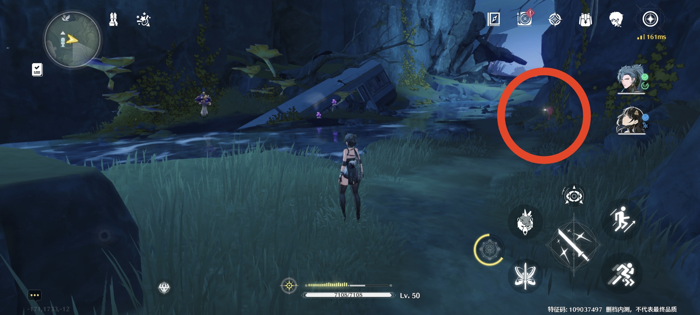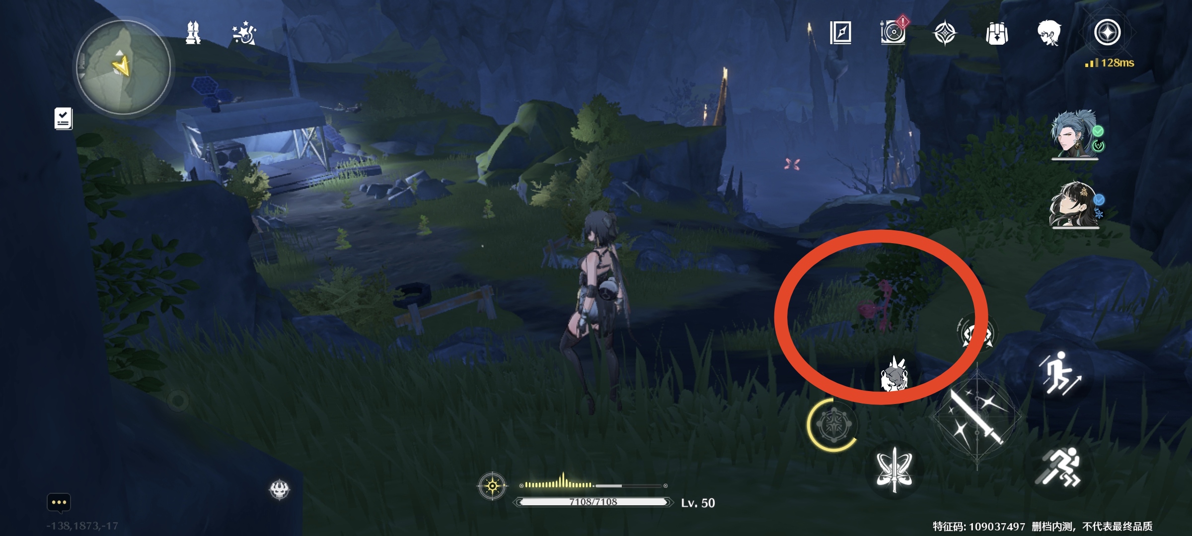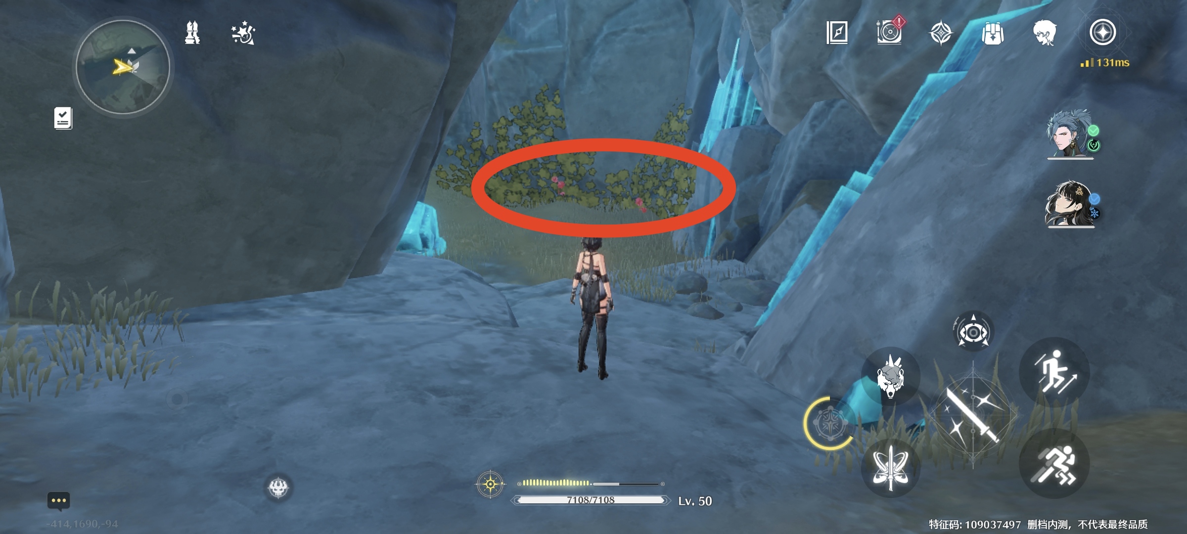 继续往里走,出来到一个瀑布旁,看到右手边西方向(小地图左边),路边有1个