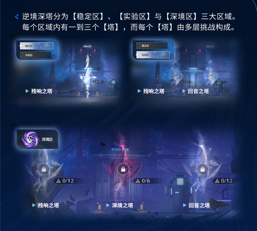 逆境深塔分为[稳定区][实验区]与[深境区]三大区域。每个区域内有一到三个[塔],而每个[塔]由多层挑战构成。