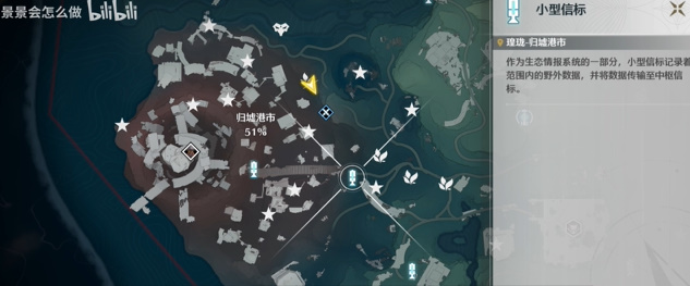 1、妙弋花主要分布在归墟港市东侧,跟着下面图片所示的采集路线采集大约可以获得20个左右,完成采集之后需要等待一会儿才会刷新。