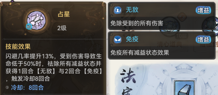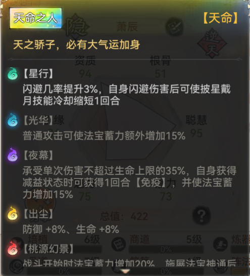 其次萧辰被动自带很高的闪避率,配合其天命【星行】不仅可以增加闪避几率,成功闪避后还可以加快技能【披星戴月】的释放时间,极大的增强了其队伍保护能力。