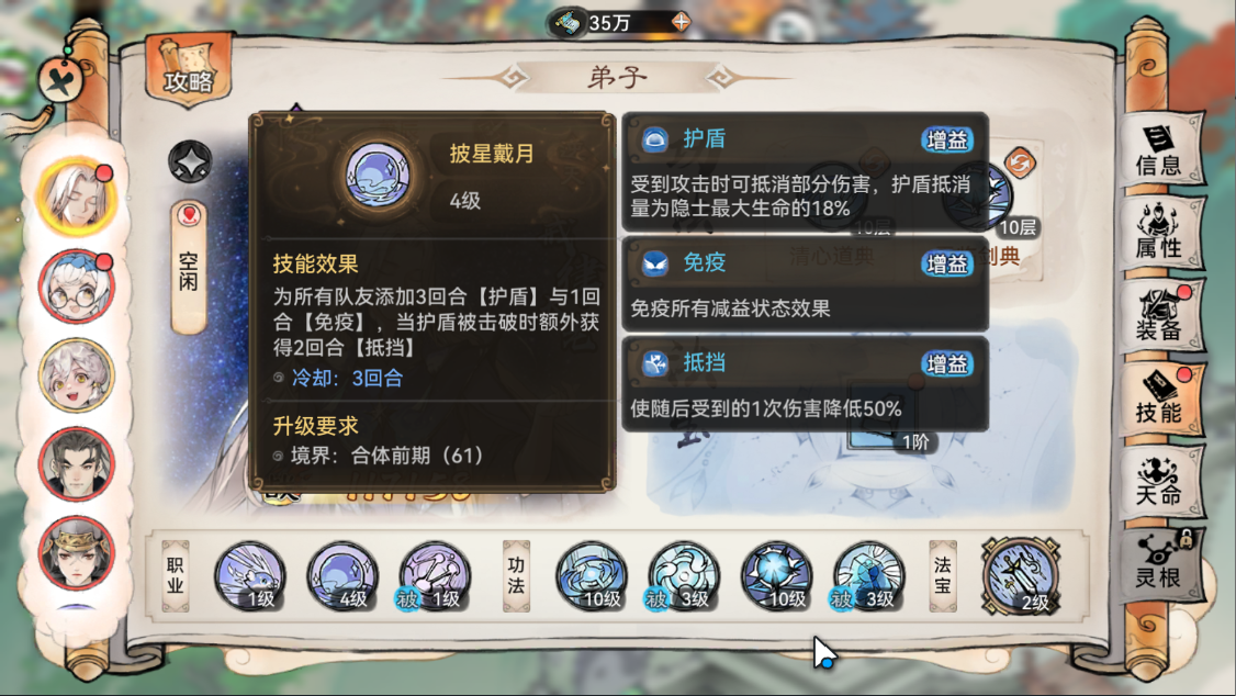 首先【披星戴月】技能不仅可以为全体队友增加护盾,还可以给全体队友增加一个免疫所有减益状态的效果。在护盾被击破时还可以获得一次高额减伤。