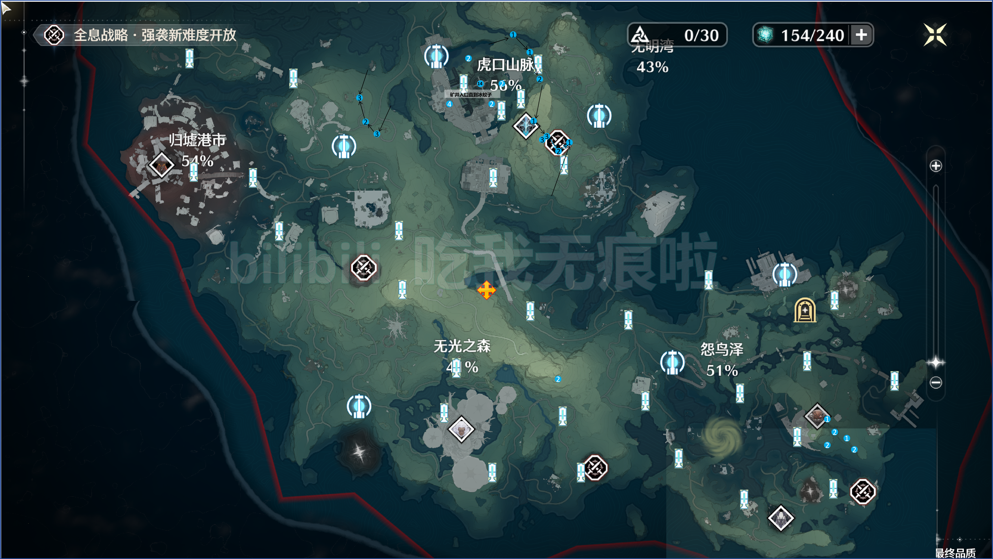白色数字代表矿石在地表或山坡上,黑色数字代表矿石在地下或山洞内,部分矿石添加了路径说明。