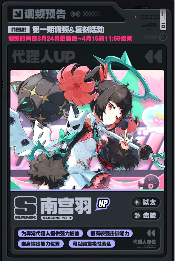 南宫羽:南宫羽是《绝区零》中人气极高的S级代理人,作为偶像组合“妄想天使”的队长,其背景设定融合了天才、财富、神秘种族与独特个性等多重元素。