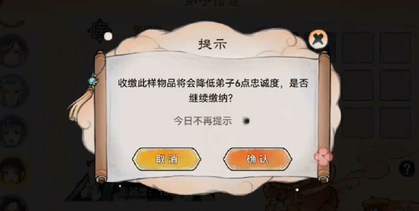 4、玩家要注意不要让弟子的忠诚度低于20,收缴物品的时候控制一下。