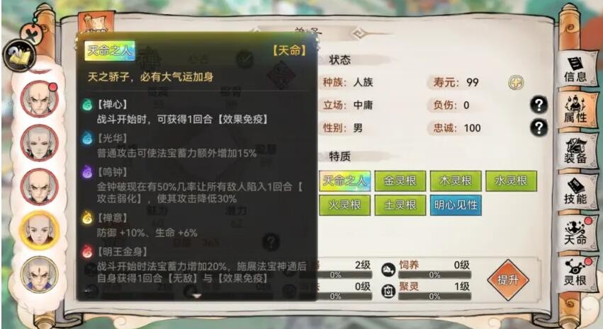 禅修:1弟子橙色红色品质五灵根+天命禅心/2弟子品质橙色以下,五灵根+不 灭之体/不死之躯/药灵圣体/自愈之体(还是需要赌出来天命禅心)