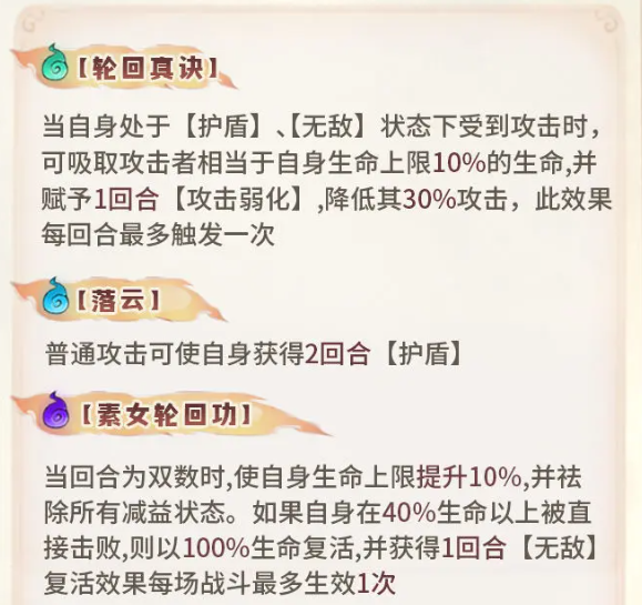 蓝1天命【落云】可使南宫婉每次【普通攻击】获得【护盾】,而【护盾】又可通过绿1天命【轮回真诀】每回合吸取敌方生命值并施加30%的攻击弱化。