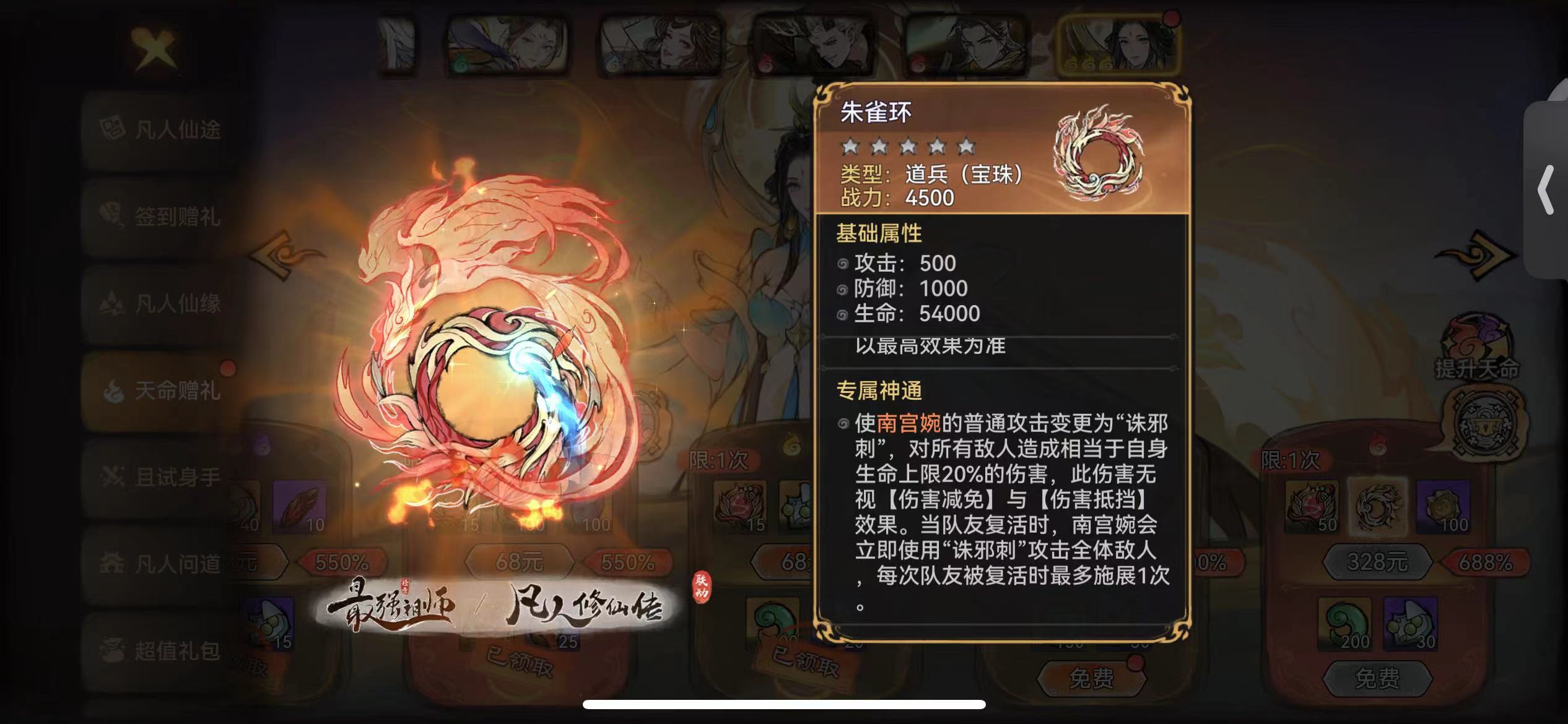 道兵【朱雀环】进一步加强了【普通攻击】在这套玩法中的地位,让【普通攻击】成为南宫婉每个回合的首选。同时也让【复活】成为了【普通攻击】的触发器,进一步丰富了南宫婉的功法和法宝选择。