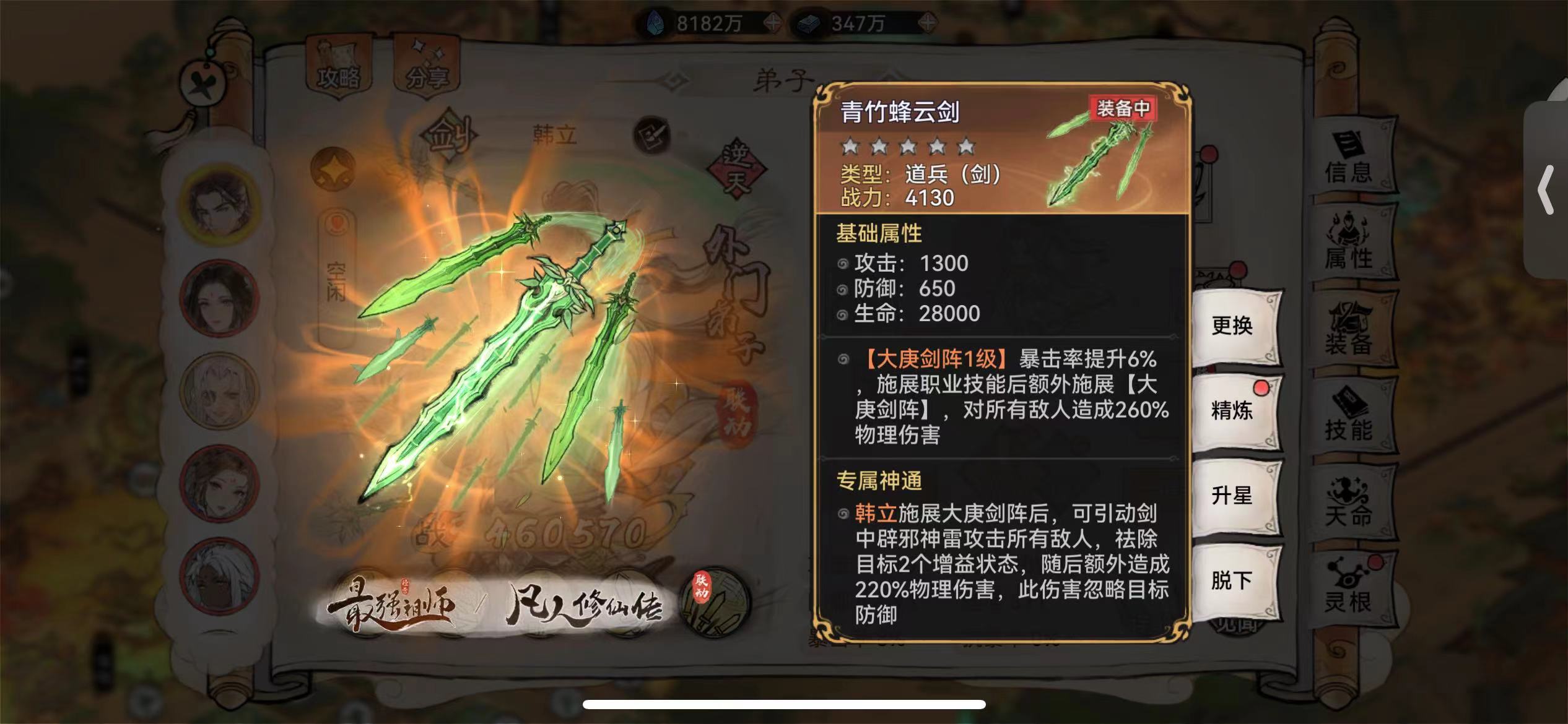 【青竹蜂云剑】能够赋予【青元剑芒】额外的【辟邪神雷】,使韩立的每一发主动技能都是多段伤害,进而与功法【虚灵妙诀】、仙缘弟子唐蝶衣的职业被动【歌舞升平】等需要多段伤害获取最大收益的技能强强联合。