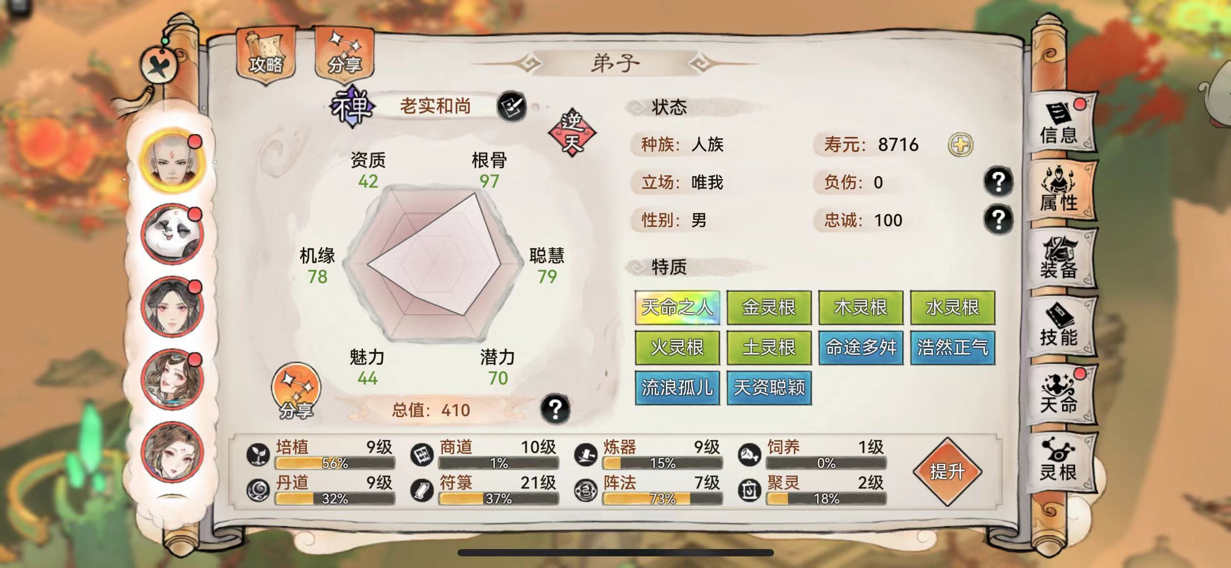 以上弟子六维,一般要求是九转之后,潜力必须70,根骨80+。