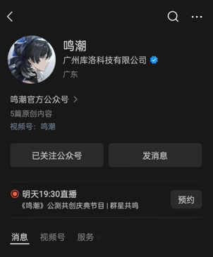 1、首先搜索鸣潮并关注官方公众号,然后点击右侧的发消息。