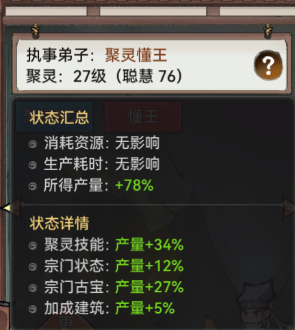 之后,我们再来简单看看生产弟子的一些词条,除奇才类词条,游戏中还有很多额外的,对生产有影响的词条,帖主在这里可以分成两类:“经验类”与“产量类”。我们先来看看“经验”词条,用我们的主角团角色【杨安】举例。如图,可以看到杨安拥有词条【聚灵奇才】,其效果为“获得聚灵经验增加20%”,再看面板,【杨安】的聪慧为50点,所以我们可以等效为杨安拥有70点聪慧,具有70%的聚灵经验获取效率!