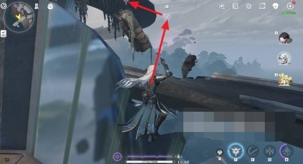 5、跳起后往左侧转头可以看到空中的两个钩子,按T钩住,到达上方的公路;