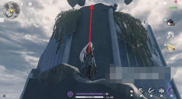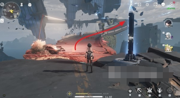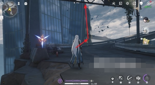 2、之后从传送锚点出发,沿着空中漂浮的公路往前走到下图箭头位置;