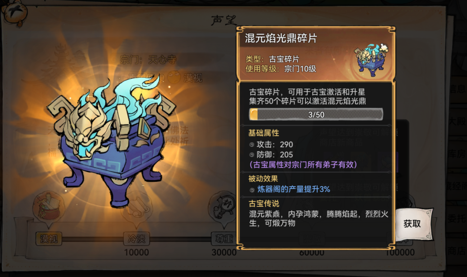 此外随机宗门的橙色古宝也会刷到品质特别好的,特别是加产量加成的(如下图的加玄铁产量的,平常只能靠抽古宝活得)。
