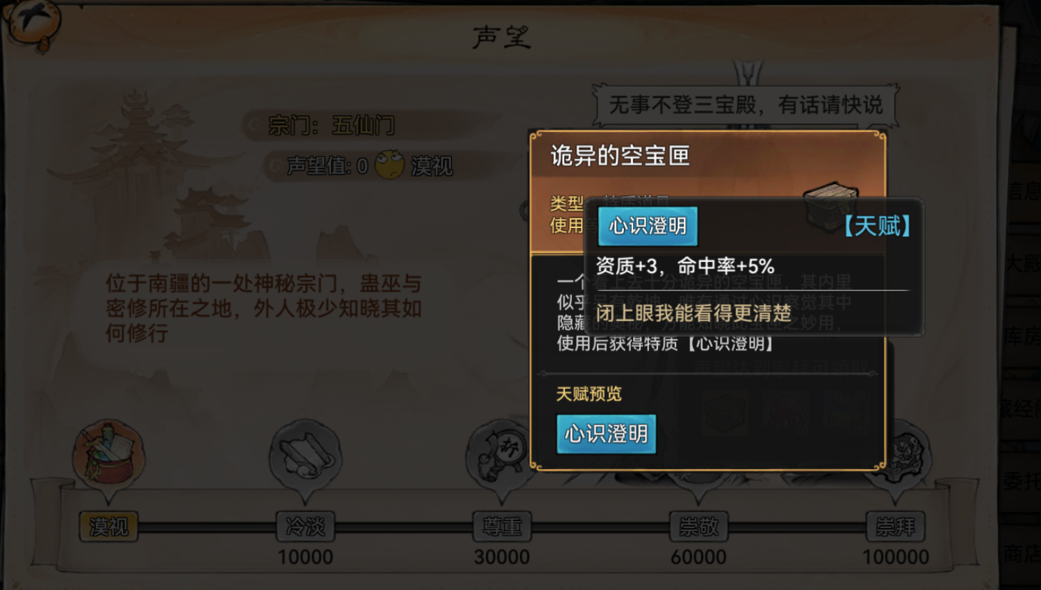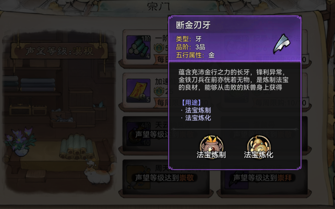 在地图上随机生成的宗门经过改版后以强、中、弱来显示,宗门的满级好感度赠礼以及商店限定款都是完全随机的。和主线宗门不同,中和强宗门满级好感度会送一个加特质的道具(弱宗门只会送橙品加6维的丹药),而宗门商店满级是购买3级炼制材料。