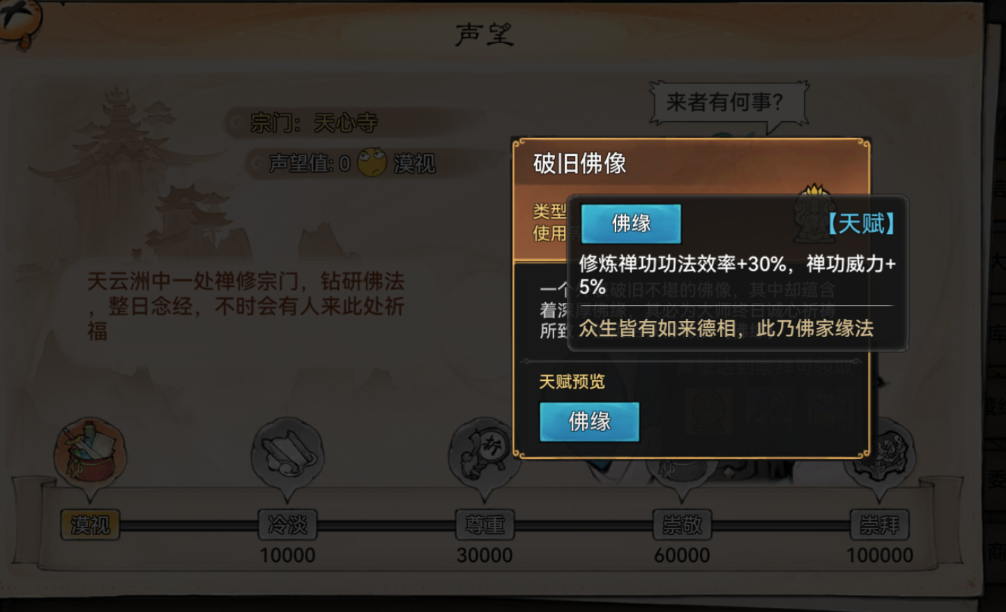 以阿月的随机宗门为例,天心寺满级送道具+佛缘,对大威天龙队是十分有用的。宗门的白嫖道具猜测也与宗门门派描述有关,比如天心寺是禅修为主,送的是+禅功威力佛缘,五仙门是蛊修和密修,送的是+命中率的空宝匣。不知道是否是小彩蛋。