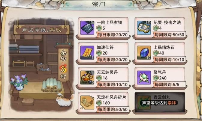 近期热补丁后青云的一阶玄铁让其成为最具性价比的商店,没有之一。建议尽早开出尊重声望拿到8折卡,每天100w灵石兑换10w玄铁,简直不要太爽,另外橙色的精炼石也非常好用,特别到合体期后开放四阶装备,精炼石奇缺。
