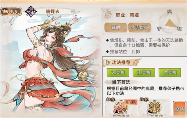 辅助地位无可撼动的舞姬。不管你的主力弟子是龙人、卫寒、韩立、老李、三七甚至是新出的石头人,蝶衣酱的技能机制都给你伺候的服服贴贴。