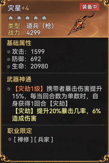 其次,在一些特殊关卡,比如生存压力不大,但己方输出欠佳的关卡,我们可以选择让龙人带【灾星】碰碰运气,其提供的暴击率、暴击伤害和伤害加成都是很不错的,龙人一般第一回合就会变身,该道兵可以帮助龙人在第一回合就打出爆炸伤害,可以很有效得清理掉某些很恶心的后排的小怪,比如毒关里的毒蜘蛛。