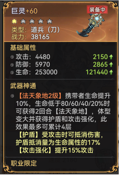 【巨灵】可以在龙人“敏感肌”(即被boss碰一下就变身)触发时,为其提供大量护盾和高额攻击率加成,在极大减少龙人暴毙几率的同时,也不怎么影响我们吃煞刑被动。