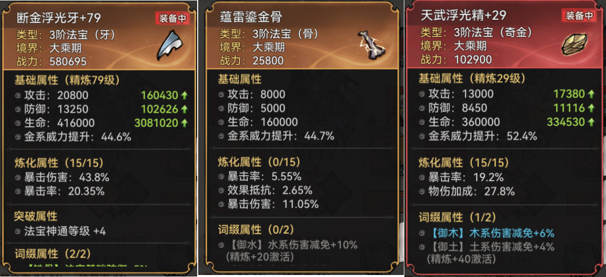 PVE方面敖天法宝选择和PVP差不多,只是炼化有所区别,正常都是选择三阶牙、骨最佳,庚金次之;