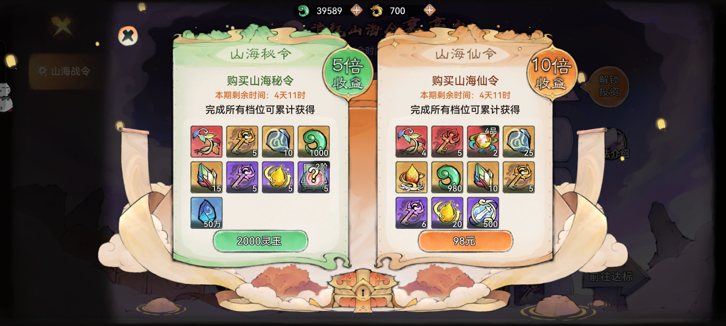 消耗山海令达到一定数量,可以解锁山海战令,通过投资可以获得大量游戏资源,建议富裕的宝子酌情投资。
