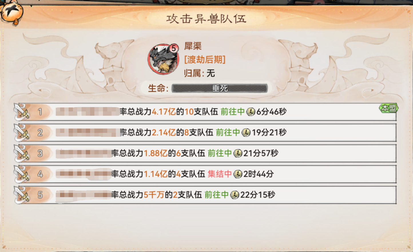 3、最后一击:收割完仙盟附近异兽后,利用时间差,将仙盟位置搬迁至其余异兽群脸上,减少出击时间;统计所有成员针对不同异兽的历史伤害数据,密切关注异兽的剩余血量,合理计算集结时机和伤害输出,确保一击必杀。