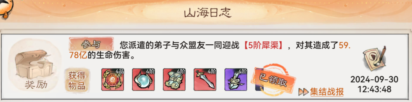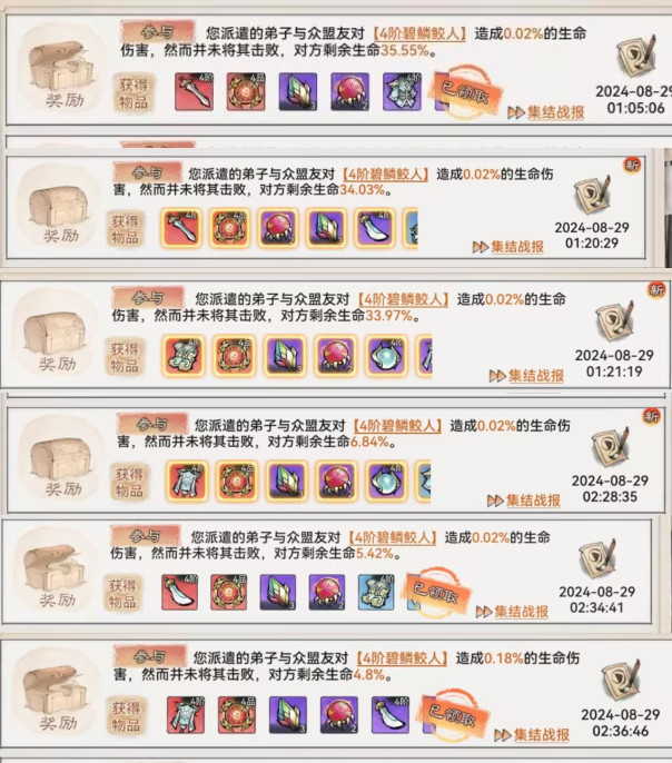 4、专属异兽。盟主或者副盟主每天有2次探寻机会,有概率发现专属四阶异兽。由于专属异兽只有本盟成员能进攻,可以利用这一点最大化收益:发车的所有队伍仅上阵1个庶务弟子,只要异兽不死就可以不停出击,理论上可以进攻数百次。实测未调概率的兽核爆率600体力一个(由于未击杀,所以数值偏大);调整之后大概200~300体力出一个(时间跨度太长,未留存记录)。