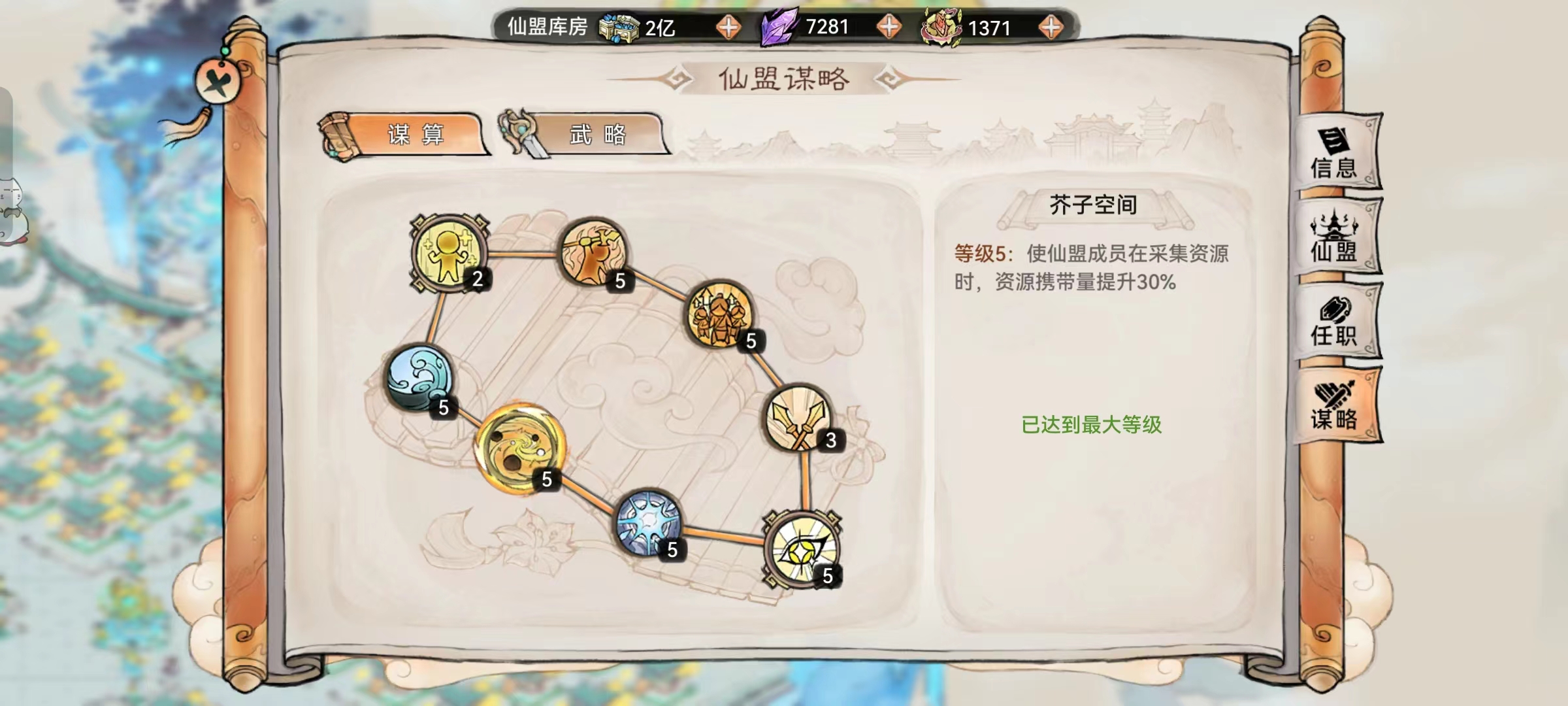 7、芥子空间:提高仙盟成员采集资源携带数量,建议升满。