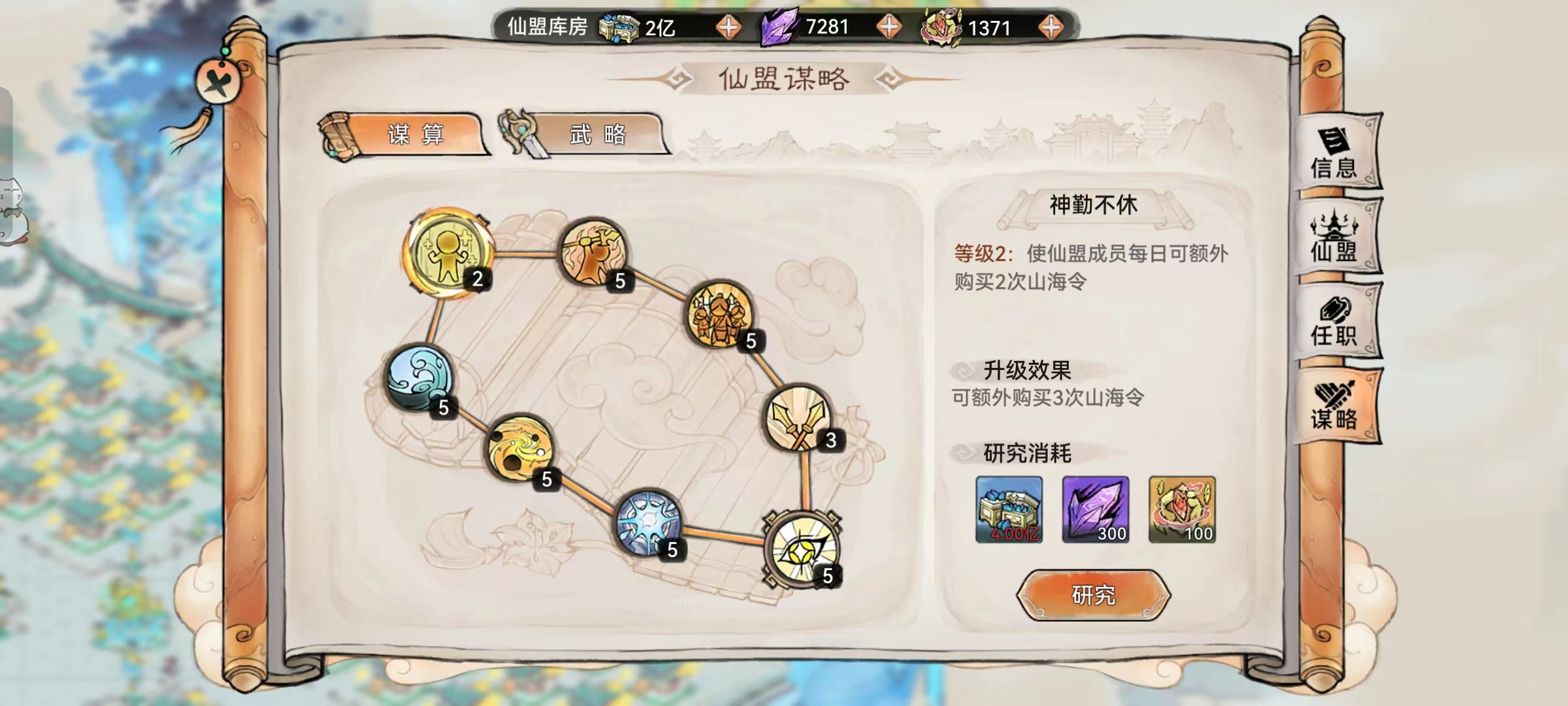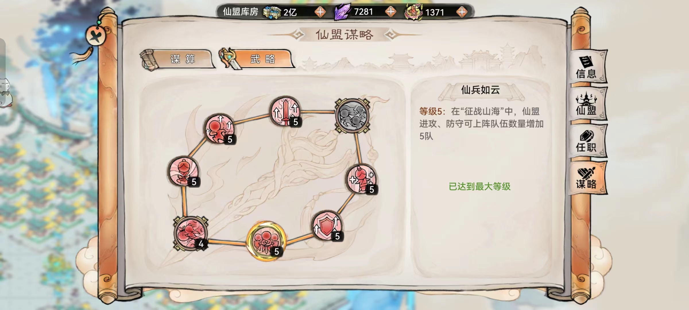 3、仙兵列阵:异兽讨伐初始集结队伍默认最多5队,升级该谋略可将队伍上线提高至10队,建议升满。