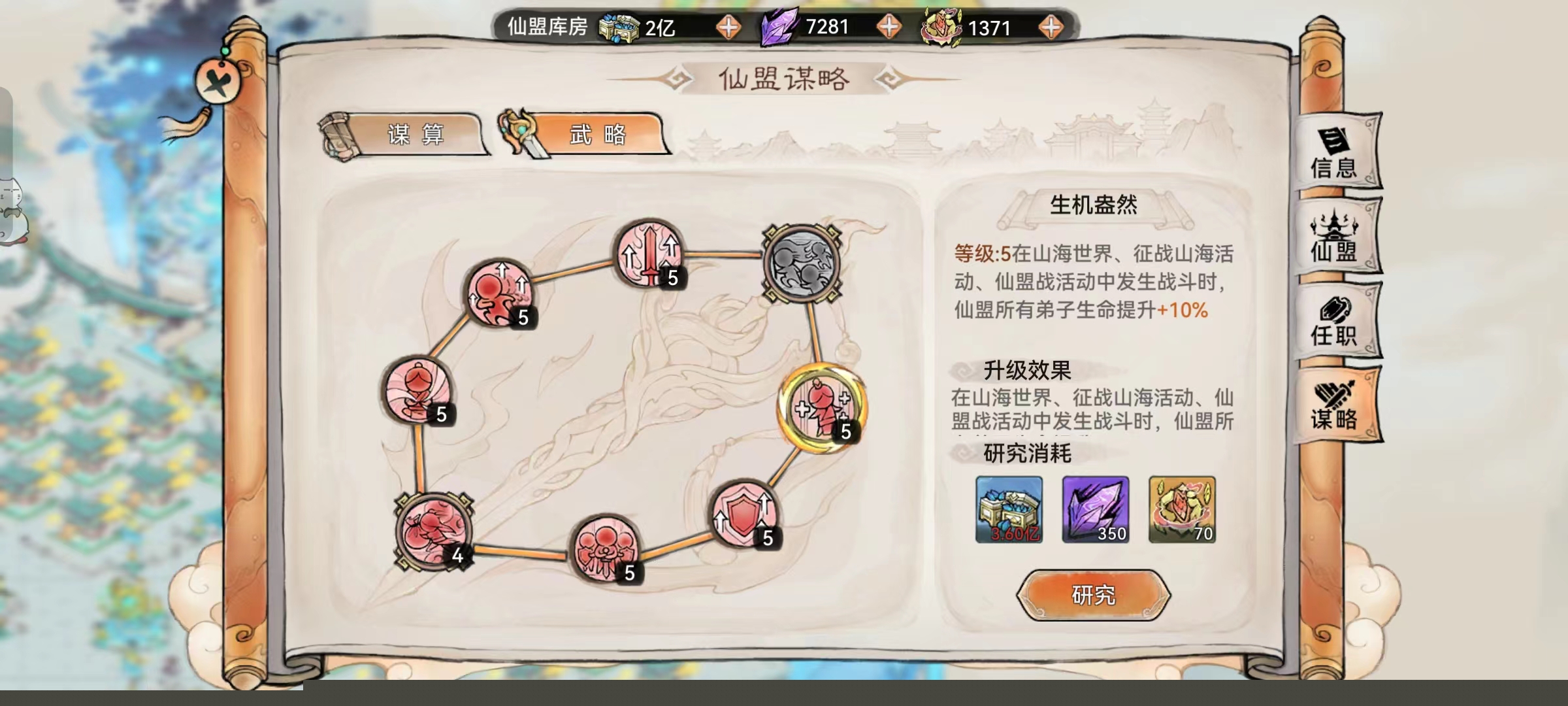 4、生机盎然:增加仙盟所有弟子生命,建议升满。