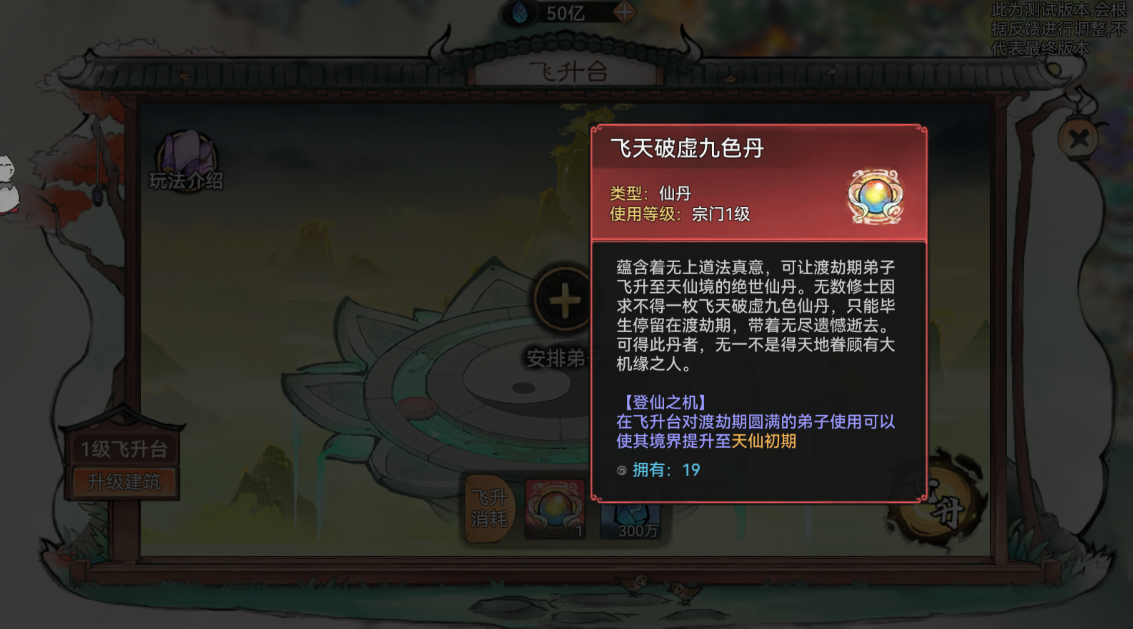 当弟子达到渡劫圆满,我们点击“突破”即可跳转到飞升台,我们可以消耗灵石和“飞天破虚九色丹”来帮助弟子突破!