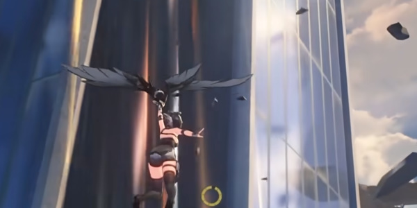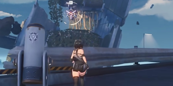 5、接着在断桥上一直往北方向走,然后来到桥边利用金色的风场飞到建筑的顶部;