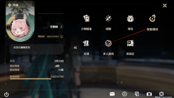 2、拿到寻宝罗盘之后,点击右上角的【终端】,然后选择【探索模块】;