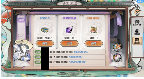 3、库房捐赠建议山海世界玩法刚开启是,每位盟员们都尽量捐满,等重要谋略开启后,可以每天只捐100w灵石。