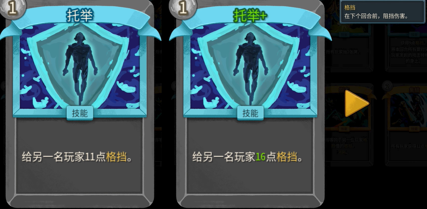 普通版的托举卡牌效果为给另一名玩家提供 11 点格挡。当卡牌升级成为托举 + 后,提供的格挡值将提升至 16 点。这里的格挡关键词意味着在下个回合前,能够有效阻挡对应的伤害数值,为队友争取宝贵的喘息机会。