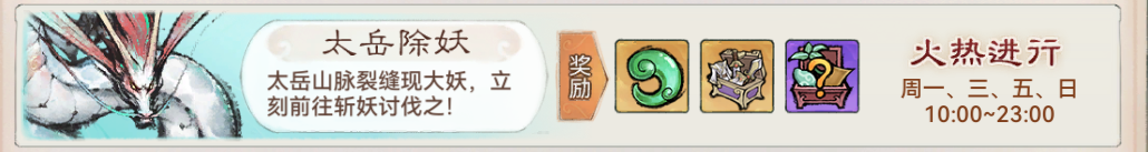 太岳除妖每次活动赠送三次免费挑战机会,有分等级梯度的伤害排行榜,同时,每次挑战可以获取一些材料(前期获取三阶材料的重要途径,且三阶材料非常稀缺)和装备。每次活动可以额外购买三次挑战机会。
