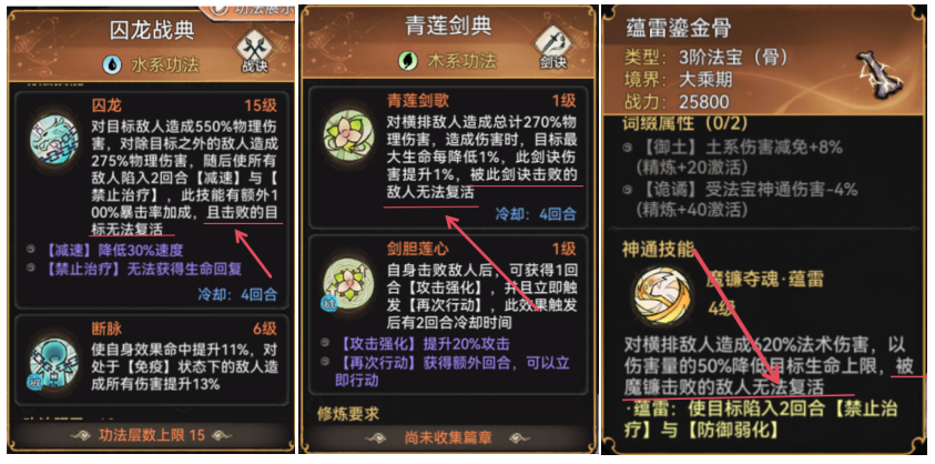 1、针对小怪回血,我们可以选择携带一些具有禁止复活效果的技能或法宝,如【囚龙战典】、【青莲剑诀】、法宝骨头等,这一点需要一定的运气,一旦能把四只小怪给禁止复活,那这关的难度将会大大降低;