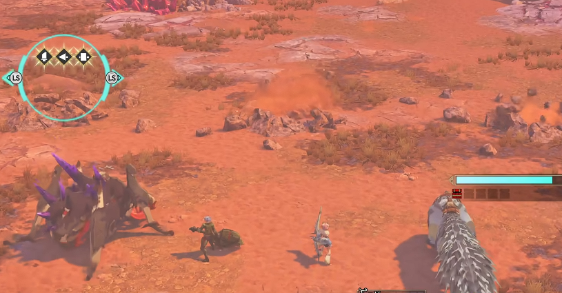 本次战斗的核心玩法,类似于一个打地鼠小游戏,只要操作正确,角龙就会直接归巢。当角龙释放钻地技能时,地面会出现几个土坑,这就是我们的操作时机。