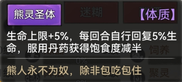 熊灵圣体:生命+5% 每回合回复生命5%(元润独有)