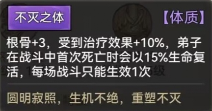 不灭之体:受疗效果+10%,死后复活