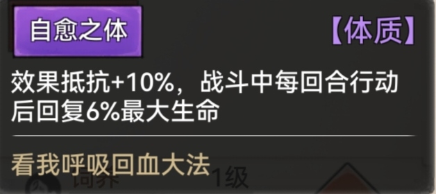 自愈之体:抗性+10% 每回合回复生命6%
