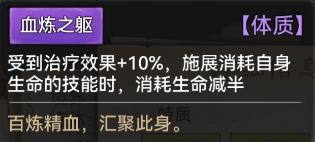 血炼之躯:受到治疗效果+10%,自身消耗生命技能减半(秦冰独有)