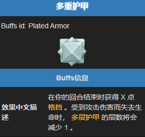 中文描述明确指出:在你的回合结束时获得 X 点格挡。受到攻击伤害而失去生命时,多层护甲的层数将会减少 1。英文描述为:At the end of your turn, gain X Block. Receiving unblocked attack damage reduces Plated Armor by 1。这意味着该状态既能提供稳定的每回合防御,又需要玩家注意保护层数,避免被轻易击穿。