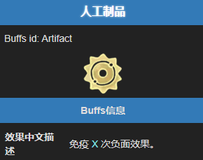 该状态的中文描述为免疫 X 次负面效果,英文描述为 Negates X debuff(s)。这意味着拥有人工制品状态时,可以免疫 X 次负面效果。每次受到负面效果影响时,消耗一层人工制品抵消该效果。该状态可叠加,层数越高,能免疫的负面效果次数越多。