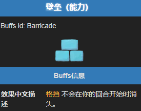 类型属于通用 BUFF,玩家和敌人都可拥有,且不可叠加。正常情况下,每回合开始时,玩家和敌人的格挡值会清零。拥有壁垒状态时,格挡值不会在回合开始时消失,而是保留到下一回合。这使得玩家可以积累巨额格挡,实现长期防御。注意:壁垒的效果优先于外卡钳。外卡钳只能保留部分格挡,而壁垒保留全部。