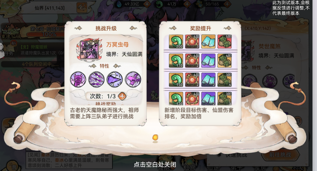 1)、每天三次免费挑战次数,可花200灵玉额外购买3次;